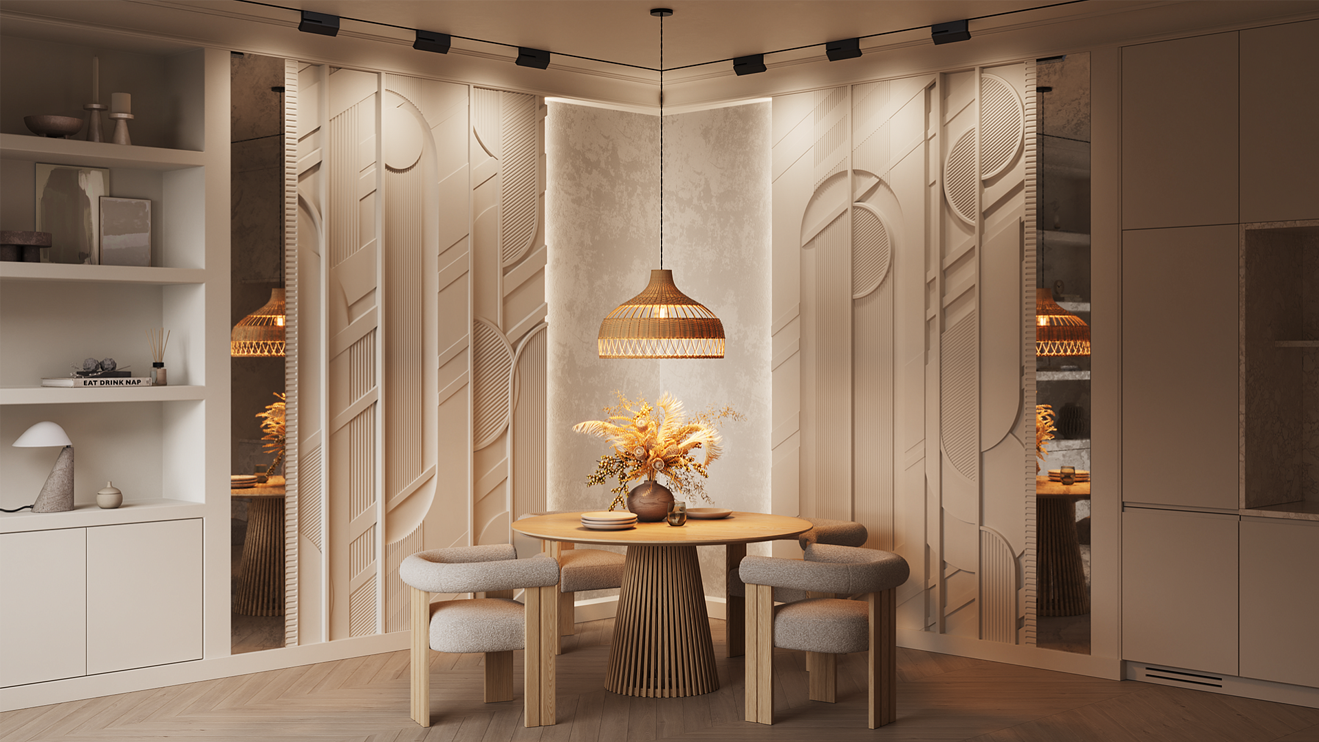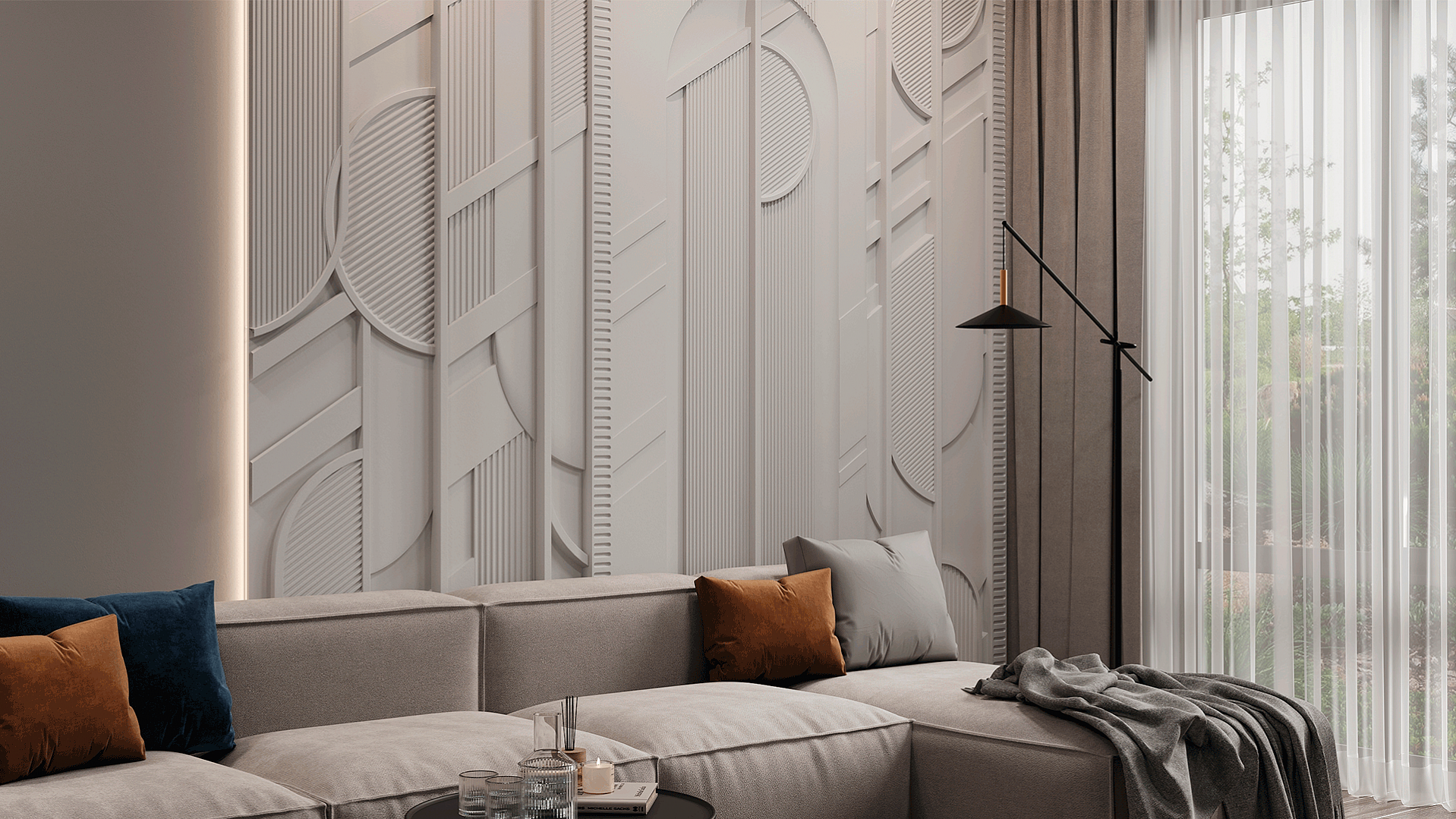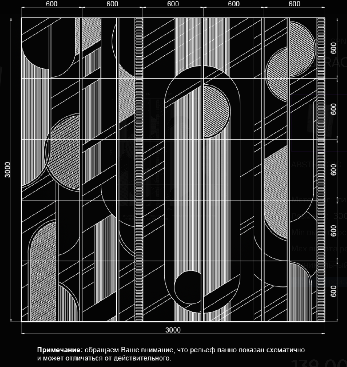 Абстрактная композиция из геометрических форм и линий панно Abstractio создает завораживающий визуальный эффект, приглашая погрузиться в творческий мир ассоциаций. Это настоящий арт-объект, способный каждый день вдохновлять на новые идеи. Панно размером 3000 х 3000 мм из 25 гипсовых 3D-панелей с глубоким рельефом станет центром притяжения, подчеркнет утонченный вкус и нестандартное мышление владельца. Возможность подсветки открывает новые грани в восприятии. Круглая подсветка, гармонично вписанная в дизайн, не только обеспечивает функциональное освещение, но и усиливает футуристический эффект. Тщательно проработанный рельеф с чередованием вертикальных линий, полукругов и прямоугольников за счет игры света и тени придает бесшовной композиции глубину и объем.