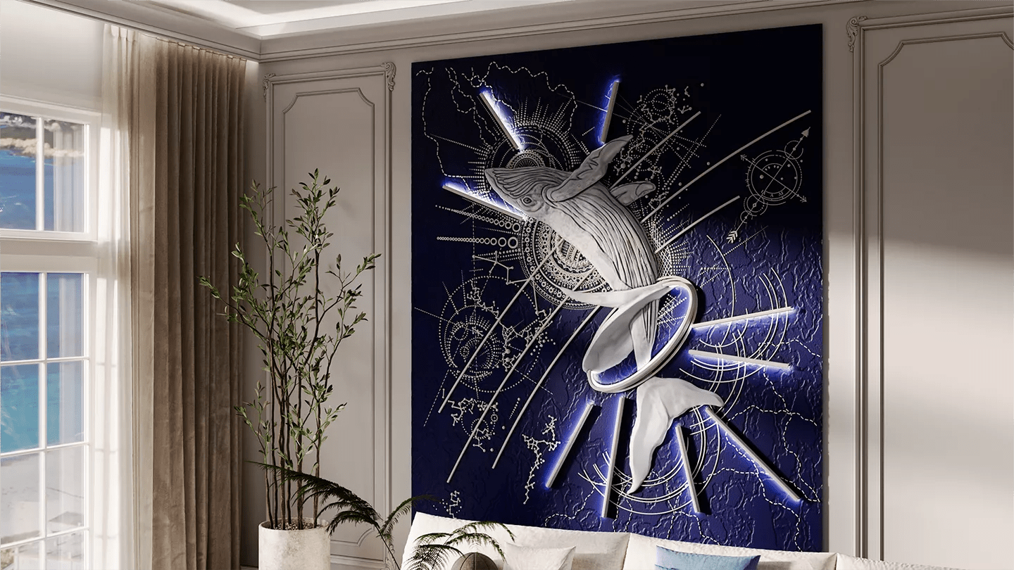 Гипсовое панно LEVITATION – это завораживающее произведение искусства размером 3000х2400 мм, способное преобразить любое пространство. Величественный кит, парящий среди космических узоров, символизирует свободу, мощь и бескрайние просторы воображения. Гипсовые 3D-панели создают потрясающий визуальный эффект, словно приглашая зрителя погрузиться в фантастический мир, где реальность сплетается с мечтой. Изящные линии и тщательно проработанные детали придают композиции глубину и объем, а использование накладных световых молдингов из гипса позволяет добиться поистине волшебного сияния. Это панно станет прекрасным решением для тех, кто ценит уникальность и стремится создать в своем интерьере вдохновляющую атмосферу.