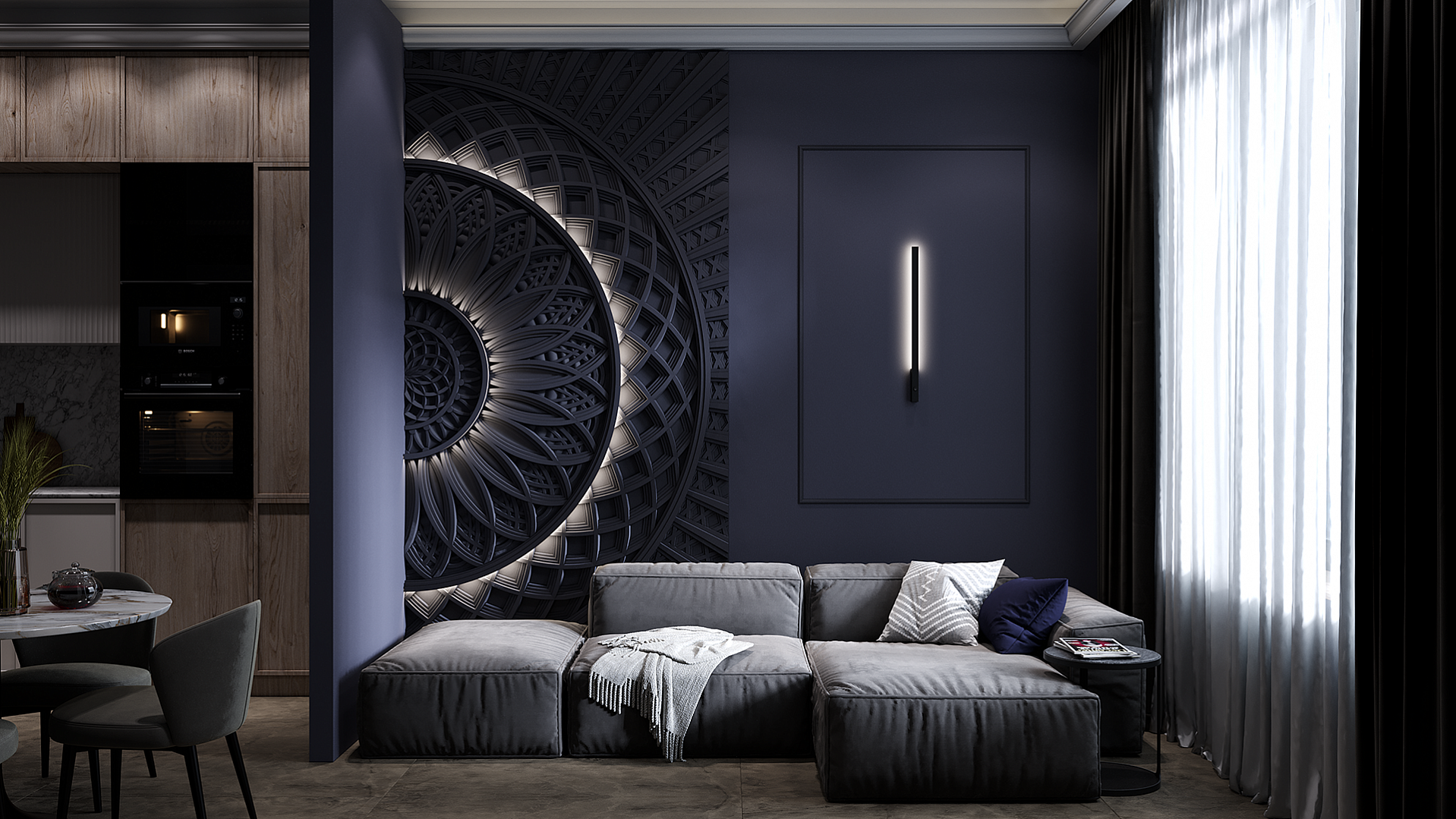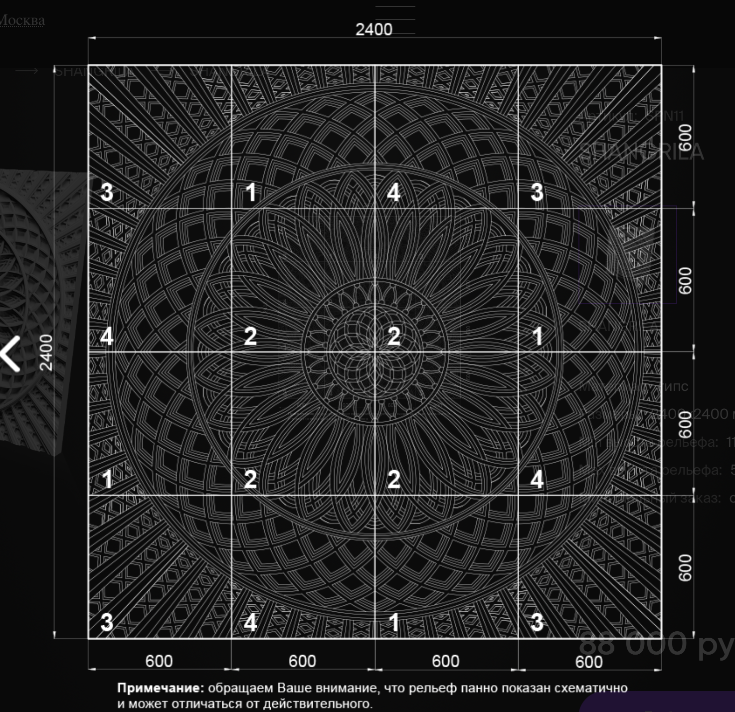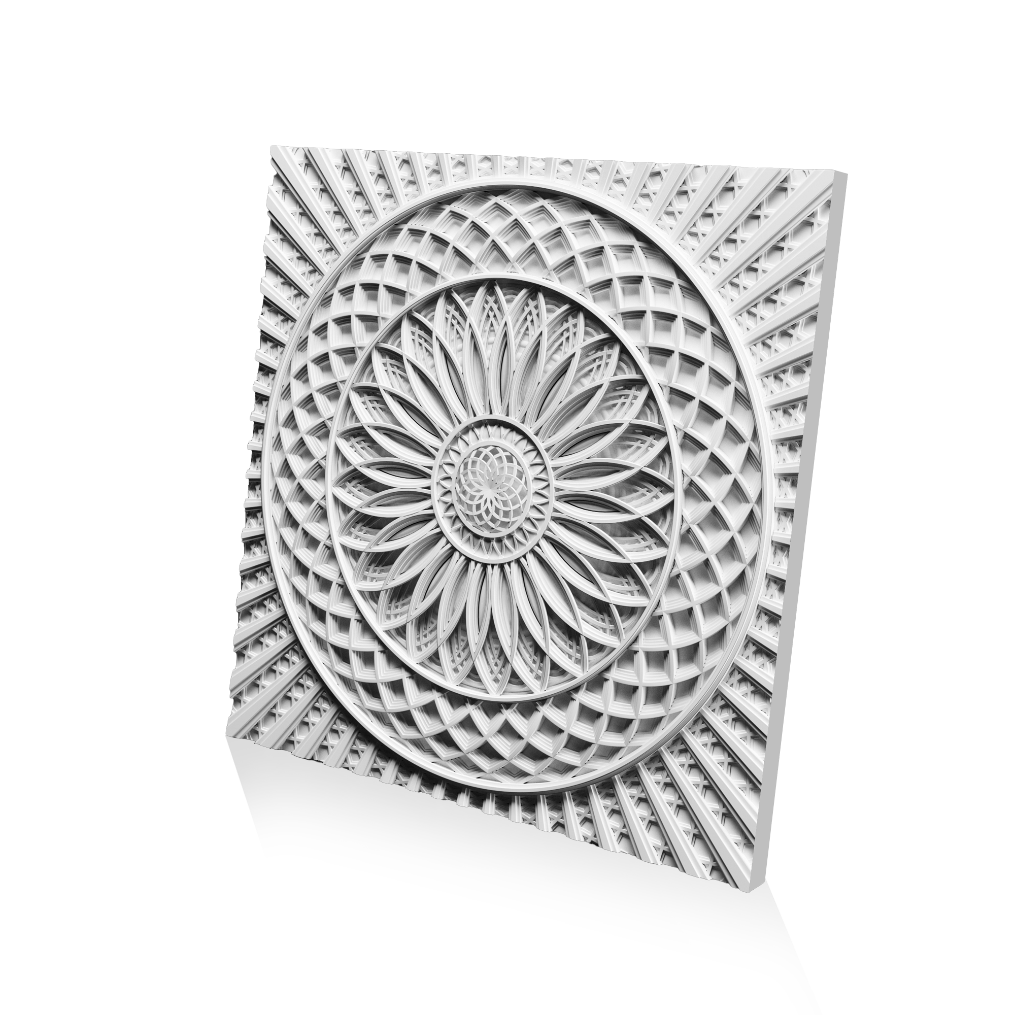 Панно SHANGRILA из гипсовых 3D-панелей станет наглядным воплощением гармонии и совершенства в Вашем интерьере, оно будет завораживать и притягивать взгляд. Изысканный, тщательно проработанный узор, напоминающий мандалу, создает ощущение бесконечности и единства с миром. Название SHANGRILA – это отсылка к мифической долине вечной молодости и мудрости. Панно способно превратить любое пространство в уголок спокойствия и медитации. Шестнадцать панелей из экологичного гипса размером 600х600 мм собираются в единое полотно 2400х2400 мм.